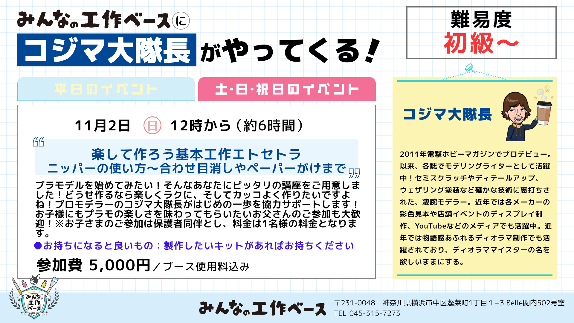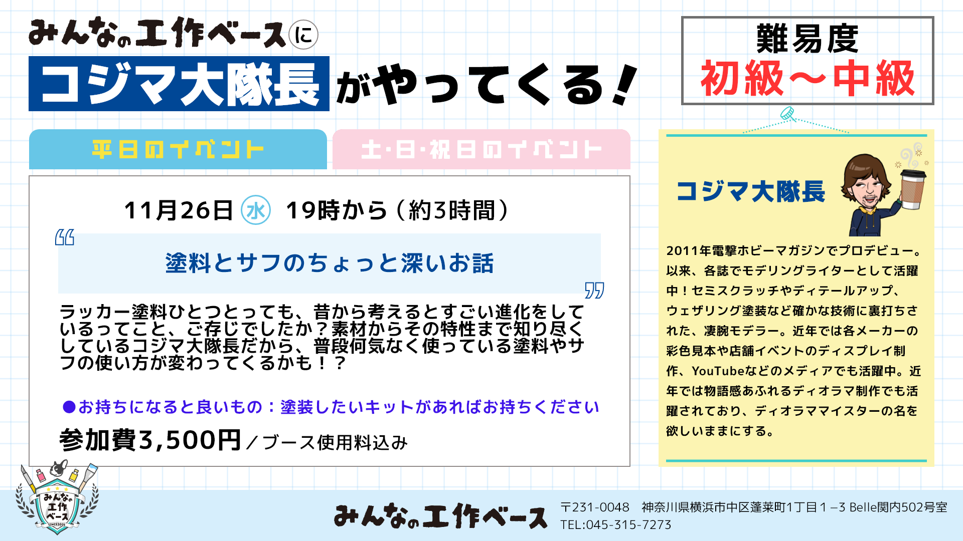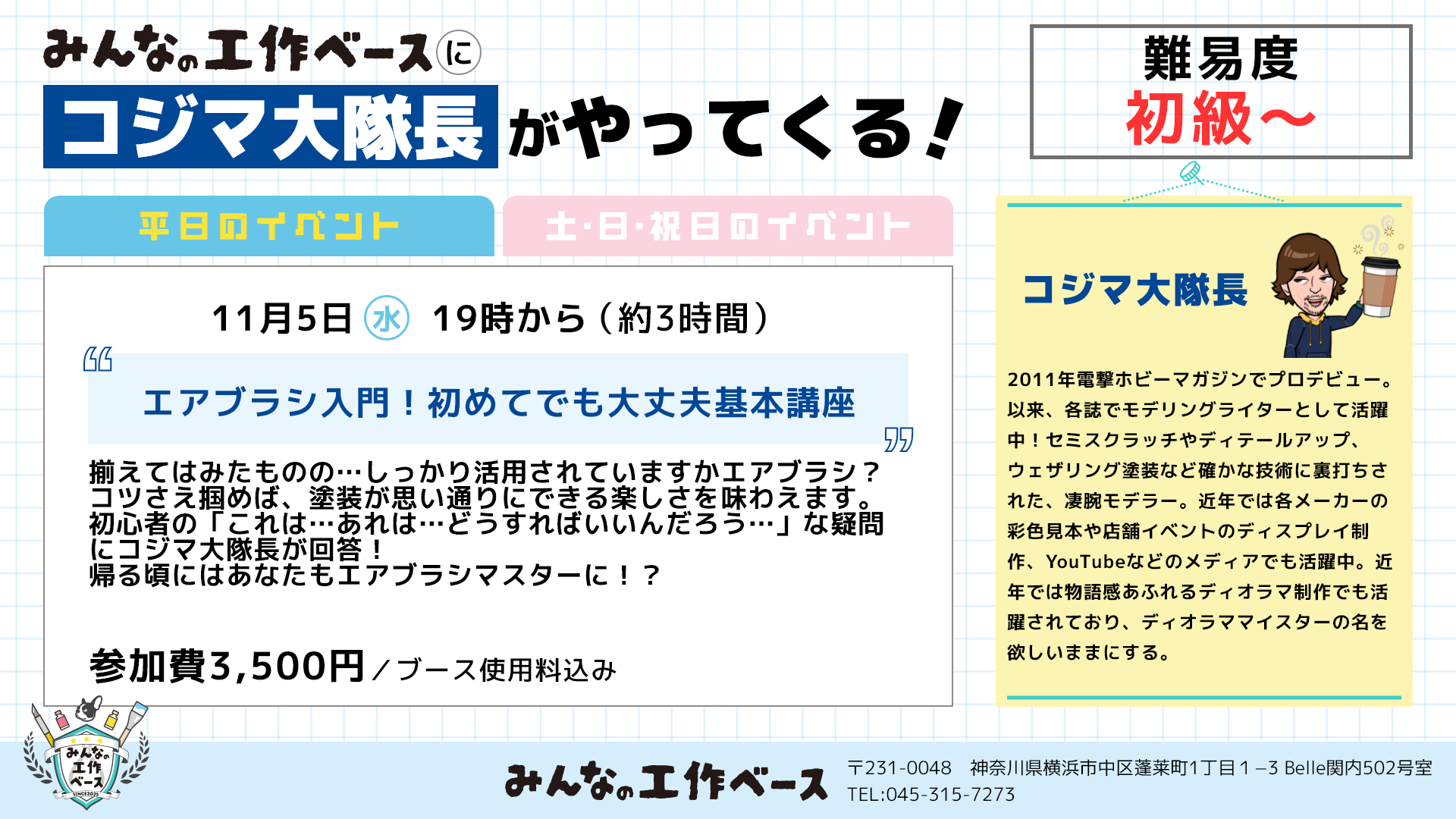 続いて11月5日(水)の企画は、「エアブラシ入門・初めてでも大丈夫基本講座」