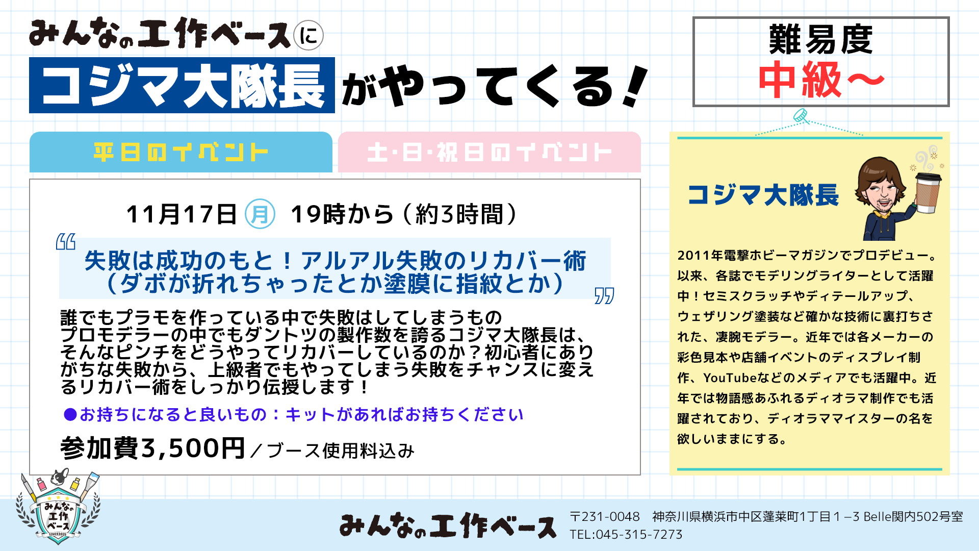 プロモデラーの中でも圧倒的な作例数を誇る、コジマ大隊長ならではの目から鱗のリカバリーテクニックを身につけるチャンスです!